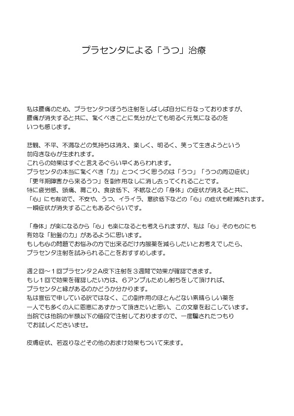 - そのようにプラセンタ注射は、患者様の身体症状から、少しずつ改善していき鬱や不安そのものも軽くしていきます。